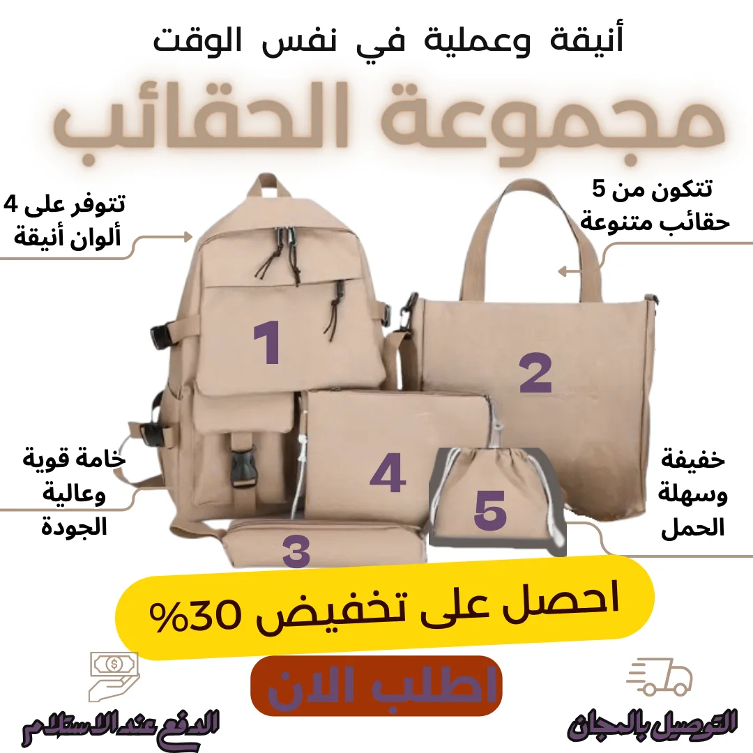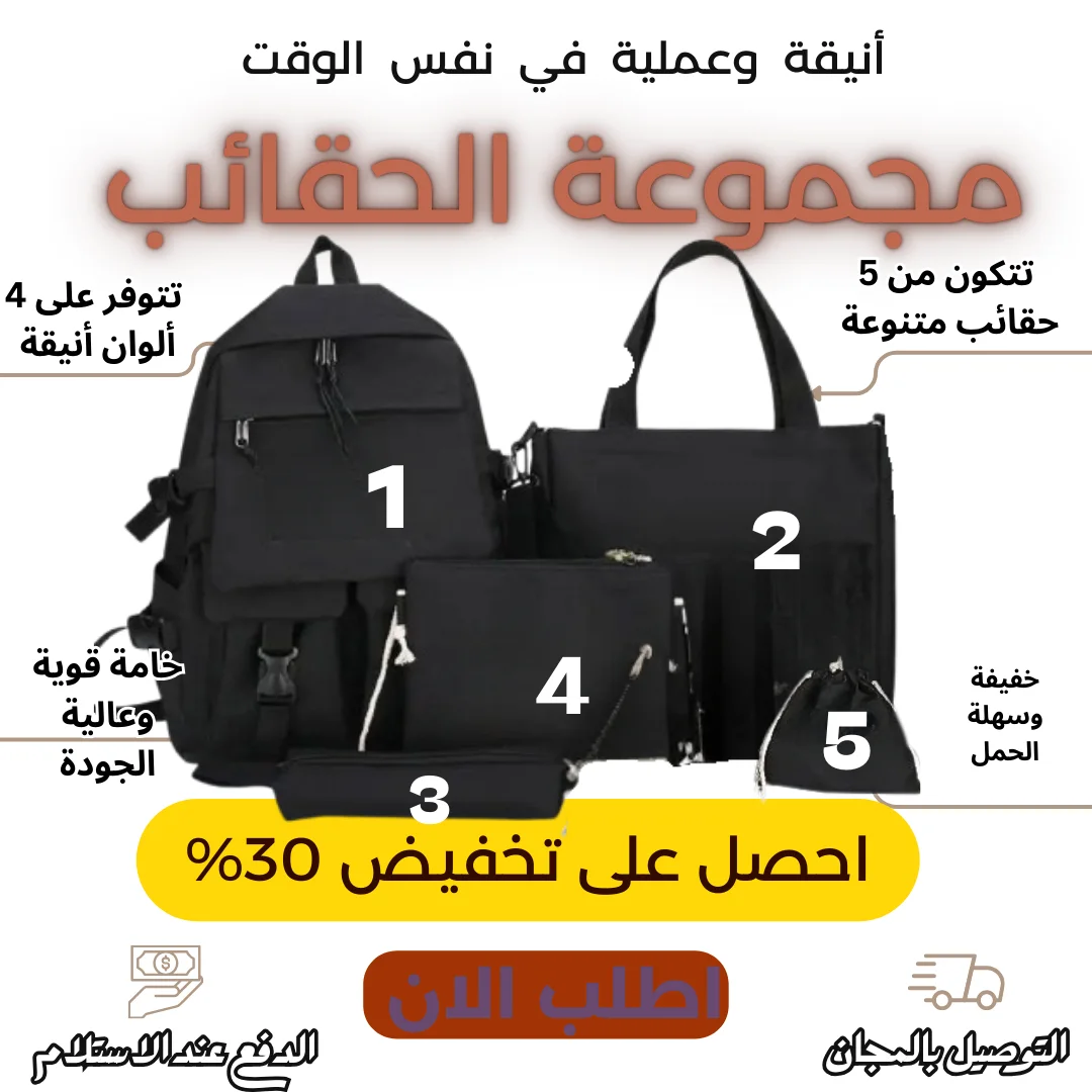 اكتشف سرّ الحقيبة المثالية مع طقم مدرسي متكامل من 5 قطع: حقيبة ظهر، حقيبة تسوّق، مقلمة، شنطة صغيرة للرقبة، وحقيبة كتف.